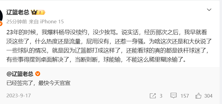 这个消息应该是比较真实的,“辽篮老总”随后继续补充:23年的时候,我爆料杨导没续约,没少挨骂。说实话,经历那次之后,我早就看淡这些了,什么热度还是流量,屁用没有,还惹一身骚。为啥这次还是和大伙说了一些球队的情况,就是因为辽篮都打成这样了,还能看球的真的都是铁杆球迷了,有些事得摆到桌面解决了,当断则断,球能输,不能这么稀里糊涂输了。